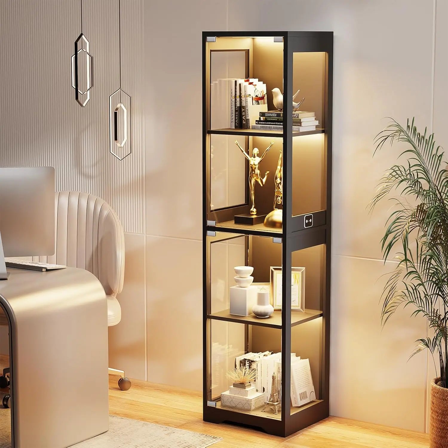 The cabinet comes with 3 color LED lights — white, warm, and blue — with adjustable brightness to perfectly highlight your collection. An intelligent human body sensing system automatically turns the lights on when you approach and off when you leave, ensuring your items are always beautifully displayed.