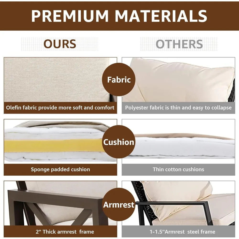 Crafted with a sturdy steel frame and weather-resistant rattan, this set is built to withstand outdoor conditions while maintaining its elegance. The cushions are soft, removable, and easy to clean, ensuring both comfort and convenience.
